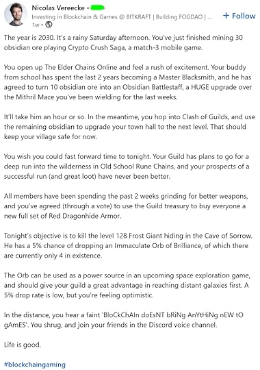 Anyone who has played games can immediately recognize that the future in which the above LinkedIn post describes fucking sucks. First of all, no one wants to spend two weeks grinding for “better weapons” — perhaps if you are a power user, but power users typically do not consist of more than 5% of a games total player base. Secondly, the balancing issues that would occur out of item cross-contamination on this scale would likely be astronomical, even assuming that all these games were made by the same developers (it seems like the implication is that it is the same chain but widely differing games). Funnily enough, the power users I had mentioned would likely only be interested in focusing on one specific game and not a menagerie of them.