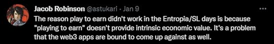 The thing that differentiates UGC from play-to-earn is that UGC is taking concepts outside the game and making them internal, whereas play-to-earn is deriving value specifically from the game. Let me say that in English: an example of UGC is someone making a rigged model in Unity and selling it for use as a VRChat avatar, whereas an example of play-to-earn would be killing mobs in Entropia Universe, gaining credits, and then converting those credits to USD. You are literally playing to earn, not creating to earn as in the case with UGC.