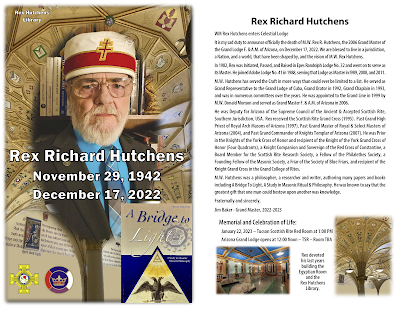 by Christopher HodappThe Grand Master of Arizona has officially announced that a Celebration of Life for Rex Hutchens will be held January 22nd, 2023 in the Red Room of the Tucson Scottish Rite Cathedral, 160 S. Scott Avenue, Tucson, Arizona, beginning at 1:00PM.