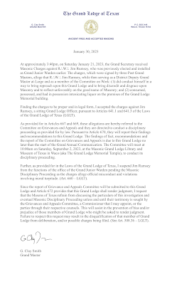 The Grand Master of the Grand Lodge AF&AM of Texas , MW G. Clay Smith, has officially suspended the Grand Junior Warden, RW James Rumsey, pending a disciplinary hearing before Texas' Grievances and Appeals Committee next September. (Click image above to enlarge.)