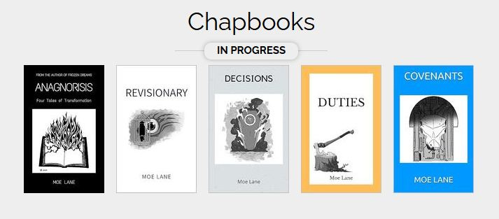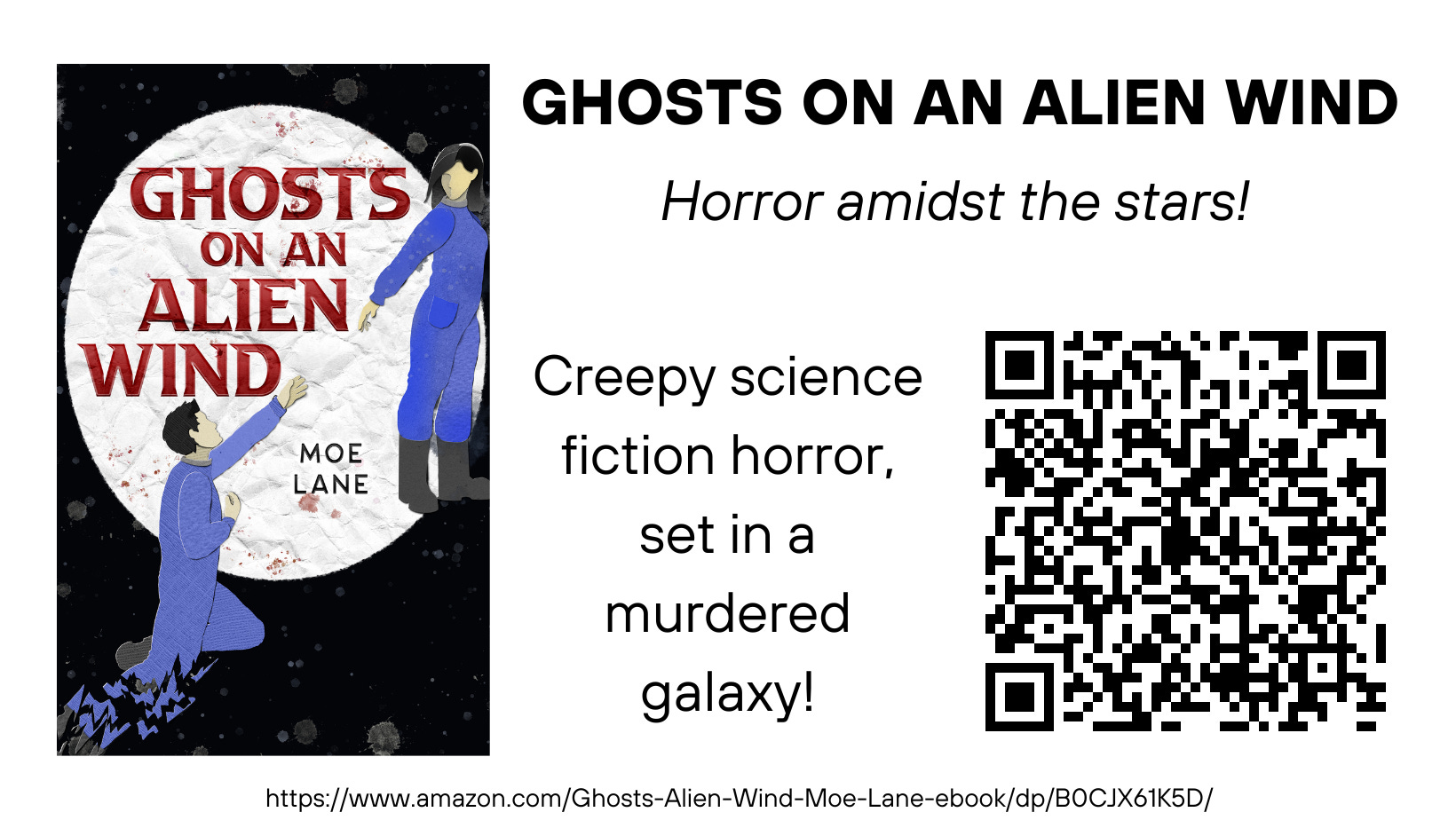 Ghosts on an Alien Wind : a Cthulhu Mythos novel where the phrase ‘Cthulhu Mythos’ is nowhere to be found. Pam Tanaka is a pilot on a world everybody except her finds disquieting. When things start to go wrong, she is faced with a mystery that could end in her entire colony destroyed. It’s happened before. It’s probably happening somewhere else at that very moment, too.Chapbooks: for these I take four of my stories from Patreon, pay an artist to draw pictures based on them, and then sell them. I like the intimacy of them.