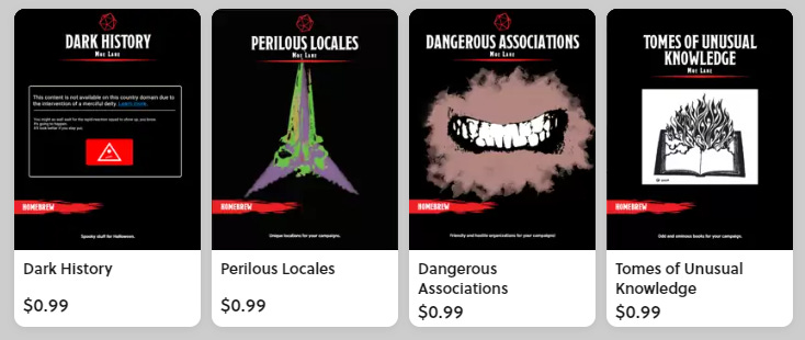 Dangerous Associations : Groups! Some good, some bad, most dangerous to know either way. Dark History : A mixed bag of spooky stuff, suitable for Halloween. Perilous Locales : places for your players to go to, and hopefully come back from. Tomes of Unusual Knowledge : a variety of books for your TTRPG campaign. Some of them may even be best described as Forbidden.Links: