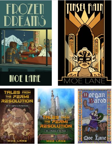 Tales From the Fermi Resolution, Volume 1: Shadow of the Tower . An anthology spanning the length of the timeline, from beginning to end. Features a chapter from Morgan Barod and a prequel to Frozen Dreams. Tales From the Fermi Resolution, Volume 2: Lights in the Darkness . Another anthology. Has a chapter from Banshee Beach (upcoming), and a Mildred Deckard story (the first one is found in TFR Volume 1). Morgan Barod : sword and sorcery in the wilds of New Jersey. Our hero is Conanesque, in the original Howardian sense (he wears whatever armor he can find, and actually has a functioning brain). Lots of affectionate jokes about New Jersey. Frozen Dreams : post-apocalyptic high urban fantasy pulp detective fiction. My first novel! Tom Vargas is a Shamus in Cin City, the tinsel capital of the magical kingdom of New California. He Clears the Cases nobody else can. In this one, he needs to figure out how to prove the murderer wasn’t the murderer. Lots of affectionate jokes about movies. Lots. Tinsel Rain : sequel to Frozen Dreams. Tom Vargas is back, and trying to solve a series of magical murders before they tear the city apart. More jokes about movies, and more of a mystery, too.Unfiltered (Science Fiction Cosmic Horror)