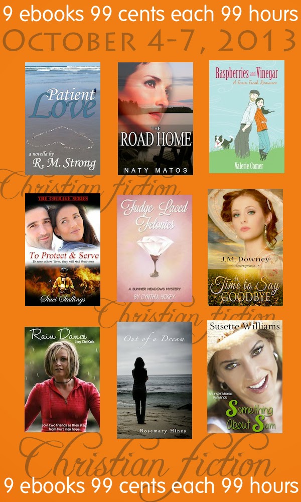 Nine Christian authors have joined together to offer you NINE ebooks, each for 99 cents for 99 hours. The sale runs from 12:01 a.m. EST Friday, October 4, 2013, through 11:59 p.m. PST Monday, October 7. Click the links below the graphic to "look inside" on Amazon and pick up your digital copies!First Lines To Protect and Serve by Staci Stallings “I promise concern for others, and a willingness to help those in need,” Jeff Taylor said as he stood, hands clasped behind his back, shoulder-to-shoulder with 28 of Houston’s finest. His chest swelled with the words he had committed to memory in anticipation of this very moment more than ten years before. “I promise strength… strength of heart to bear whatever burdens might be placed upon me…” Raspberries and Vinegar by Valerie Comer Josephine Shaw gritted her teeth as she jerked the harvest-gold range forward on worn linoleum. There it was again. That incessant scratching could only be from one source. Mice. Of course the old trailer would have the despicable creatures. It’d been vacant for how long? The beam of her flashlight found half a dozen naked newborns sheltered in a nest of insulation and wood chips. A full-grown rodent shot through the gap she’d created and scuttled right over her foot. Jo gasped, nearly dropping the light as she jerked back. A Time to Say Goodbye by J. M. Downey A lady should always have five minutes of peace. May Lynn Whitley pushed through the glass doors and made her way to the end of the porch, squeezing the rail. And she needed that peace. Something about Sam by Susette Williams Samantha Marlow had never held a job as a cook before but had always cooked for her family on their ranch. How much harder could it be to cook for a few extra men? A light tap on the window startled her, bringing her cascading back to reality. She was alarmed by the dark haired stranger’s sudden presence. As she rolled down the window she noticed a slightly amused look on his face. Patient Love by Rikki Strong Jasmine threw her phone across the room, sank down to the floor of the apartment she had moved into just days before, put her face in her hands, and cried. How could he have done this to her? Maybe if she crawled to bed and pulled the covers over her face, when she woke up the next morning, it would have never happened. Fudge Laced Felonies by Cynthia Hickey I marched into church on Sunday—not to search for God, but to find a killer. My prey stood in the corner of the foyer, lurking in the shadows. With narrowed eyes, I intended to face him. Instead, the delicious aroma of coffee wafted in the air, beckoning me like a siren’s song. I glared at the one I pursued long enough to let him know I meant business and switched my course across the tiled narthex of the large church to the fellowship wing. I needed caffeinated reinforcement before confronting the villain. The Road Home by Naty Matos When Desiree woke up that day, she talked to her lover as she used to do every morning. Talking to him used to set the tone for the rest of her day. He had something important to tell her that day. He revealed to her that He would come to take her home with him that day if the conditions were favorable, but she needed to make it happen. Out of a Dream by Rosemary Hines Michelle Baron’s heart raced, pounding in her ears. She panted, gasping for every breath. Her eyes searched for an escape. The passageway was dark, narrow. A faint beam of light flickered at the end. She fought the damp, suffocating air. Footsteps from behind made louder and louder slaps on the pavement. How much farther could her legs carry her? Rain Dance by Joy Dekok Jonica Life as I knew it ended. Stacie I wanted it to be over.