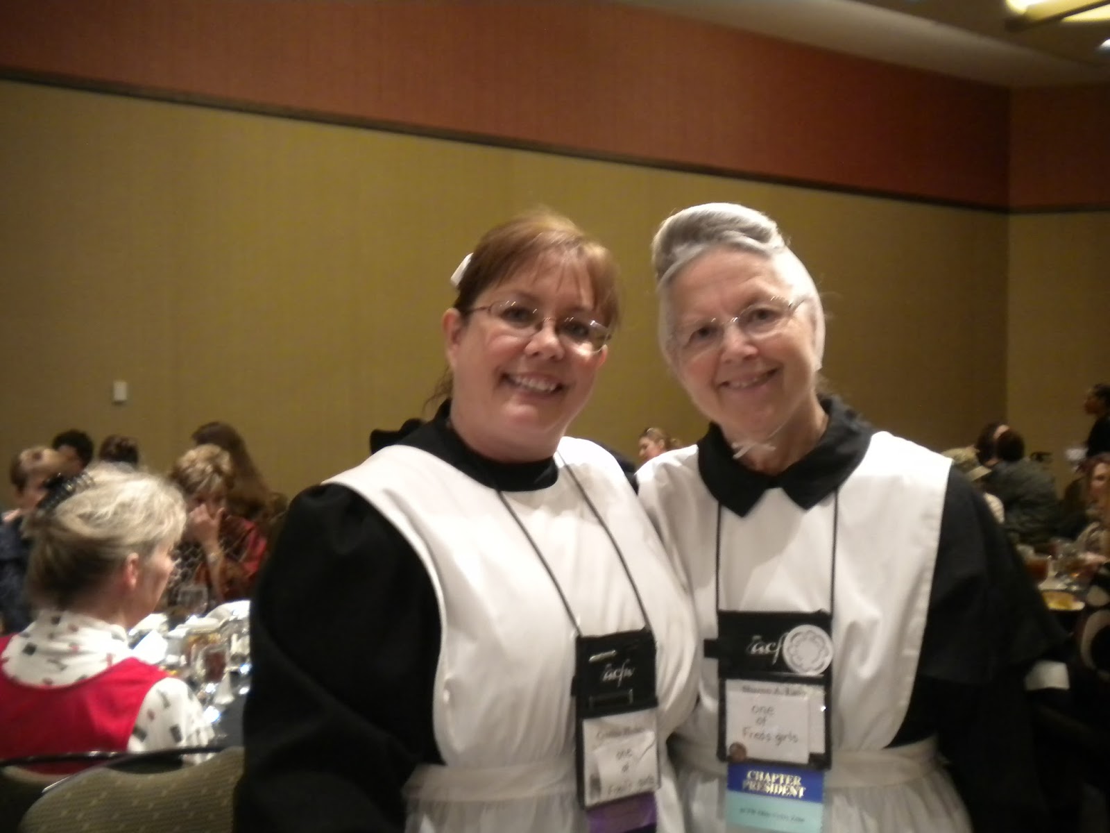 Friday night was the genre dress up night. I went as a Harvey Girl with writer Sharon Lavy. She made the aprons, thank you so much. I'm not near the seamstress she is. One person actually recognized our characters.