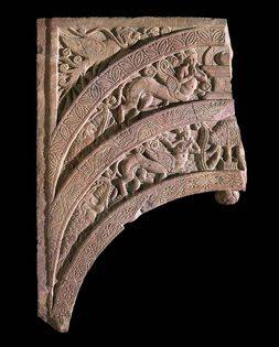 [image error] Frieze of the lost capital of the Allahabad pillar, with two lotuses framing a "flame palmette" surrounded by small rosette flowers, over a band of "bead and reel".