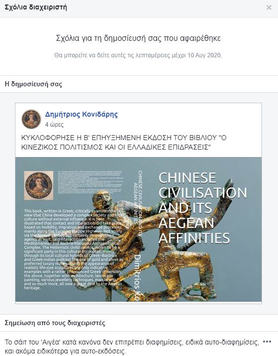 Σήμερα το πρωί της 27.07.2020 από 'διαχειριστή' της ομάδας Aegeus – Society of Aegean Prehistory αφαιρέθηκε ανάρτησή μου που γνωστοποιούσε την κυκλοφορία του βιβλίου μου Ο ΚΙΝΕΖΙΚΟΣ ΠΟΛΙΤΙΣΜΟΣ ΚΑΙ ΟΙ ΕΛΛΑΔΙΚΕΣ ΕΠΙΔΡΑΣΕΙΣ διότι: