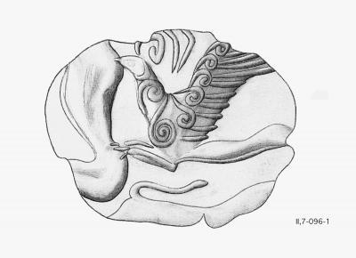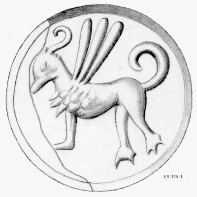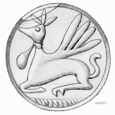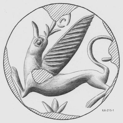 This fragment belongs to a group of carved ivories, mostly furniture elements, probably found at the site of a palace at Acemhöyük in central Anatolia. Incised on the small flat piece of ivory is a delicate rendering of a griffin, a mythological creature that combines the body of a lion with the wings and head of a bird of prey. The small hooked beak and facial markings indicate that this griffin has the head of a falcon. Its slender leonine body is seated with front legs extended and wings fully extended, giving the impression that the creature is poised to spring into action. Griffins of this type, with a spiral curl hanging down the neck and extended wings, are characteristic of Aegean art in later periods, such as the famous Minoan wall painting from the palace at Knossos on Crete that shows griffins flanking the royal throne. This object is the earliest known rendering of this type of griffin, suggesting that the motif was adopted by Minoan artisans after contacts with Bronze Age Anatolia.Η παράσταση γρύπα πιθανολογείται ότι προέρχεται από το Acemhöyük και είναι παλαιότερη του 1777/1774 π.Χ.