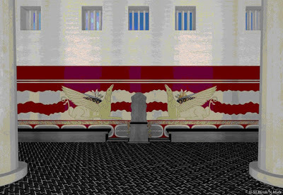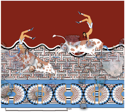 Μεταξύ των διακοσμητικών στοιχείων των τοιχογραφιών περιλαμβάνονται σκηνές με αναπηδώντες ταύρους καθώς και ταυρομαχίες εν συνδυασμώ με τον λαβύρινθο και τον ήμι - ρόδακα (Εικ. 2.5). Πιθανώς ως συνέχεια αυτών των σκηνών υπάρχουν παραστάσεις με ακροβάτες που περπατούν με τα χέρια επί του δαπέδου μέσα σε περιβάλλον φοινικοδένδρων, ένας νέος διέρχεται από σπίτια σε αγώνα δρόμου, και στην ίδια ζωφόρο άνδρας ενδεδυμένος με μακρύ ένδυμα, ίσως ιερέας, στέκεται μπροστά στην ίδια όψη. Υπάρχουν επίσης θραύσματα από πλήρεις μορφές, όπως γενειοφόροι άνδρες. Μεταξύ των ανακατασκευασμένων ζωφόρων ευρίσκουμε επίσης λέοντες που κυνηγούν οπληφόρα ζώα και λεοπαρδάλεις να καταδιώκουν ελάφια. Στην ανώτερη τάξη των αρπακτικών ευρίσκουμε έναν γρύπα. Υπάρχουν επίσης παραστάσεις όπου κυνηγοί με σκύλους επιτίθενται σε άγρια ζώα, παραπέμπουσες σε σκηνές από την αγία Ειρήνη Κέας. [15][16] Οι σκηνές είναι ενσωματωμένες στη φύση, που περιλαμβάνει πέτρες και βράχους, βότσαλα ποταμών και υποβαθμισμένη βλάστηση. Αυτές οι αναπαραστάσεις θα μπορούσαν να έχουν τοποθετηθεί στην αίθουσα όπου το διάζωμα με την ταυρομαχία, ως ένδειξη της ιεραρχίας που υφίσταται στην φύση, σύμφωνα με την ιδεολογία της Μινωικής κοινωνίας. Όλα τα εμβλήματα και τα χαρακτηριστικά είναι σαφώς Μινωικά. Δεν υπάρχει τίποτα Αιγυπτιακό σε αυτά. Τα μόνα εικονογραφικά χαρακτηριστικά που παραπέμπουν στην εξουσία είναι Μινωικά ανακτορικά εμβλήματα, τα οποία φαίνεται να προέρχονται από το ανάκτορο Κνωσού άμεσα ...