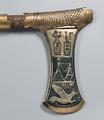 Στην Αίγυπτο Mινωικά χαρακτηριστικά όπως o γρύπας με το προσαρμοσμένο σπειροειδές σχέδιο στα φτερά και με ένθετες παραστάσεις κατά την ακολουθούμενη στην Αιγαιακή μεταλλοτεχνία τακτική, η αναπαράσταση του ανεστραμμένου τοπίου και του καλπάζοντος ζώου εμφανίζονται σπανίως, γιά παράδειγμα στον πέλεκυ και την μάχαιρα του Ahmose, τα οποία ευρέθηκαν στον τάφο της μητέρας του, της βασίλισσας Ahhotep II. Επί ξίφους από τον τάφο της παραπάνω απεικονίζονται παραστάσεις με το διακοσμητικό θέμα του καλπασμού στην μία πλευρά, με λέοντα απειλούντα ταύρο, παρέχοντας παράλληλα με ξίφη των Μυκηναϊκών τάφων. [6, pp. 148-149] Αξιοσημείωτο είναι ότι η τελευταία έχει θεωρηθεί, κατά μίαν άποψη, ως Μινωικής καταγωγής![Kelder et al. 2018, p. 12] Η ερμηνεία του ονόματός της είναι 'η σελήνη είναι ικανοποιημένη' ή 'ειρήνη της σελήνης' ή 'αυτή που τιμά τον Ah” (δηλαδή τον Ασιάτη θεό της σελήνης). Σε μιά σύντομη παρέκβαση σημειώνουμε ότι κατά τον Ηρόδοτο, Ηδτ. 2.43.2, ο Ηρακλής υπήρξε Αιγύπτιος θεός, είχε δε μητέρα την Αλκμήνη, της οποίας το όνομα, κατά περίεργο τρόπο, σχετίζεται με αυτό της σελήνης (μήνη είναι η σελήνη), παραπέμποντας (;) στην Ahhotep!