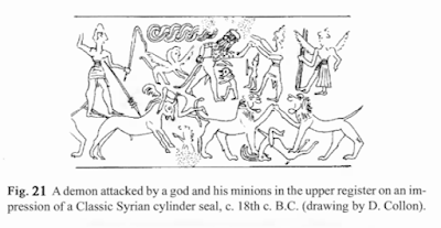 p. 104 .. The dogs and the archer have not yet appeared in any literary version of the slaying of Huwawa, so again it may be that the Mesopotamian artistic tradition was used in this case for a local myth or legend. Clark Hopkins in 1934[34: https://www.jstor.org/stable/498901] demonstrated that this scene of Mesopotamian origin was the source of Aegean depictions of Perseus slaying the Gorgon: the original Huwawa (himself an improvisation) in some form reached the Aegean and was there t