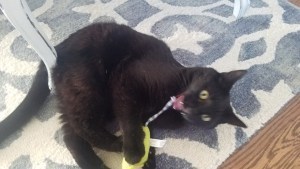 I came home and opened the master and everything is normal, except new Roomba is stopped by the side of the bed with a long, black petrified-looking thing beside it. OMG. No. IT. CAN’T. BE. It surely looks like an ancient, petrified cat turd. Ugh. It is! HOW? WHY?!