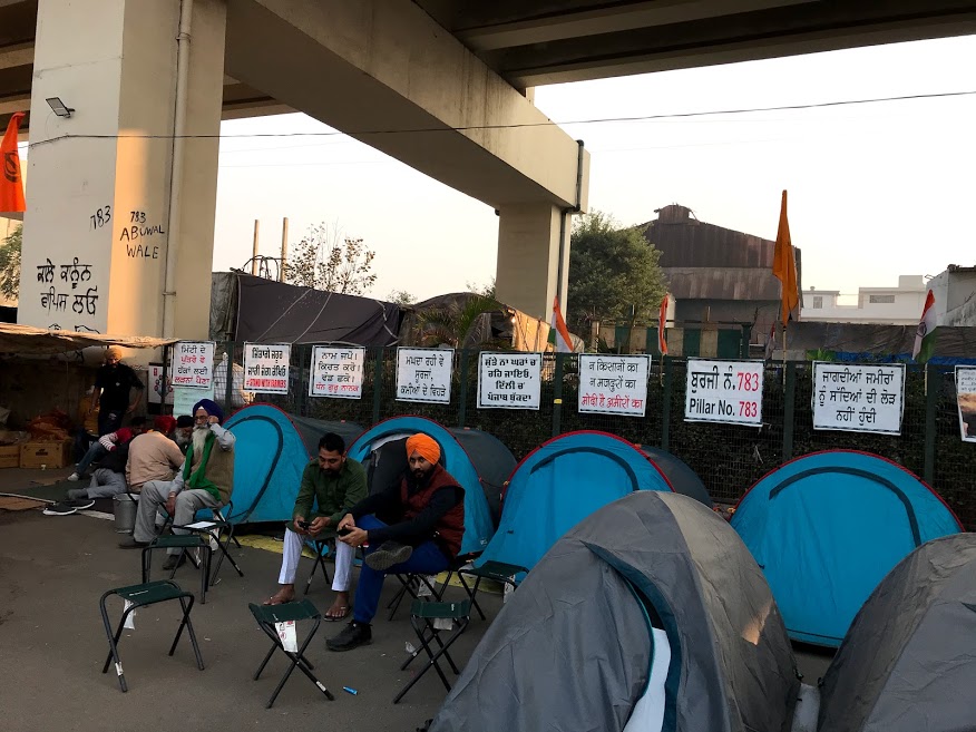 Under the metro line for a few kilometers, each metro pillar is an address for the homes the farmers have made for last seven weeks. Pillar 772 is Faridkotiyan da langar. Pillar 783 on one side is Shaheed Bhagat Singh Library and on the other side a tent city.