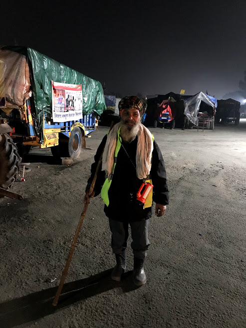 It is dark. The tractor-trolley township at Singhu is asleep (mostly). A solitary figure walks its lanes with a stick in one hand. As he crosses an unlit section of the narrow muddy service road, which sees all the local traffic in the day, he turns on the torch light. Occasionally, he blows the whistle that hangs around his neck.
