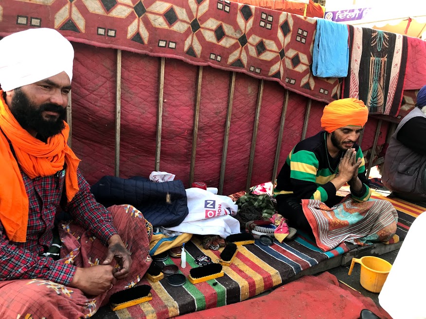 ‘Our plan was to stay here for 4-5 days, but once we reached here and started sewa, we just don’t have the heart to leave.’ Ajeetpal’s throat chokes, his eyes water as he discusses his journey to this place about fifty meters behind the Sanyukt Kisan Morcha’s stage, where he spends is days cleaning, mending, polishing footwear of the farmers.