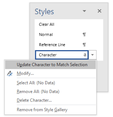 Create a New Style Name it Character Choose Character for Style Type Change the format to Arial, Bold, 14pt Click OKMatching Styles