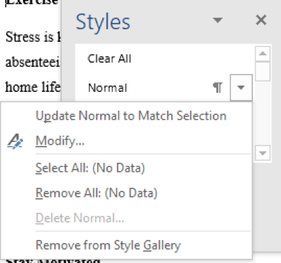With the document still open, after the Normal style click on the drop-down arrow and choose Modify Format the Normal style to Times New Roman, 12pt, Justified Click on the Format button and choose Paragraph Choose a Special indentation of First Line Change the Line Spacing to Double Click OK Click OK again Highlight the heading and click on the Heading style to apply that style Highlight the paragraph and click on the Normal style to apply that style Save the document as “Styles” and close itTo learn more about advanced word processing, click on the image below: