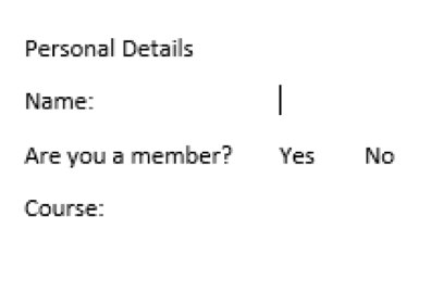 Forms can be created in a document allowing other users to fill in their details. A range of different fields in a form can be used such as checkboxes, text fields and drop-down menus. Many elements of a form can provide other users with a means to enter personal details. This is useful as it allows the collection of data for the creator of the form. Settings can be applied to allow only the creator of the form to edit the structure of the form.