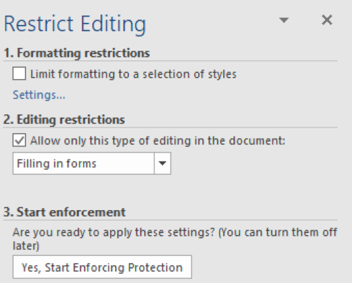 3. On the Restrict Editing pane select the Allow Only This Type of Editing in the Document checkbox