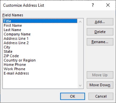 7. Press the Rename button to change the name of City to Town and click OK until you are left with First Name, Last Name, Address Line 1, Address Line 2 and Town