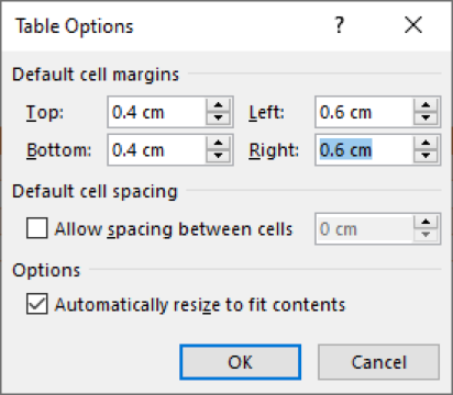 The margins between cells in a table can be set using table options. The margins are set in centimetres and users can also apply spacing between cells. Another option is available to resize the cells to fit its contents.
