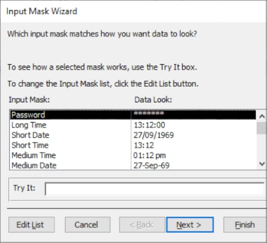10. Scroll down through the list of Input Masks available until you reach the Telephone number Input Mask
