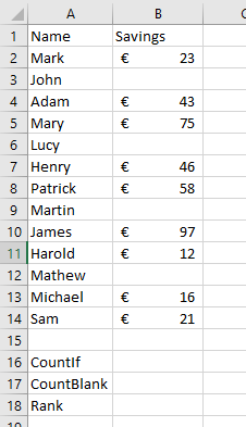 Select cell B17 On the Formulas tab in the Function Library, select More Functions then Statistical Select CountBlank Select the cell Range B2:B14 Click OK This Counts the Blank cells in the RangeRank.Eq