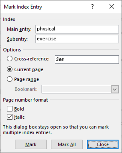 3. In the Index group, click on Mark Entry