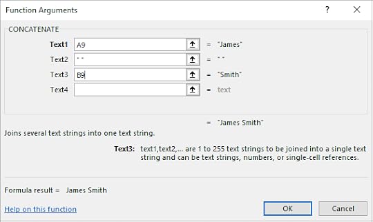 ConcatenateThis function takes a number of separate cells containing text and joins them together in another cell. This can be useful if a user has a list of contact details and wants the first name and surname of each contact to appear in a single cell.