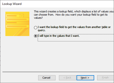 4. For Data Type choose Lookup Wizard