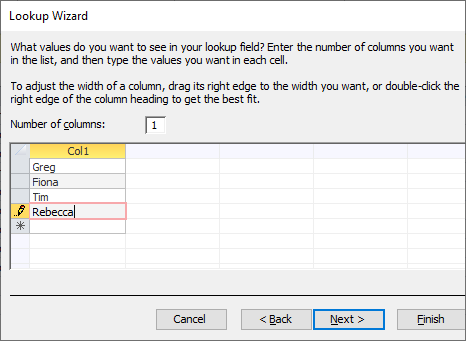 This is a field that contains all of the values that can be entered. This can help to reduce typing mistakes as users can select an entry from a predefined list. Settings can be applied to allow only entries from the list to be entered. Users can either type information into a field or lookup values from another table.