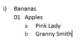 Outline numbering can be used to create formatted lists. For every new list level, a specific formatting can be applied e.g. numbers for the first list level and lowercase letters for the next.