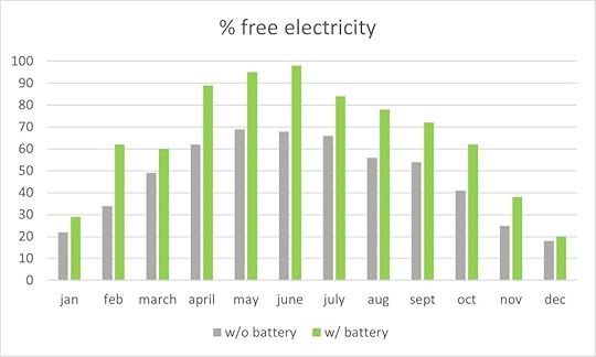 The graph below shows the amount of free electricity we get from the solar panels, before and after installing a battery.