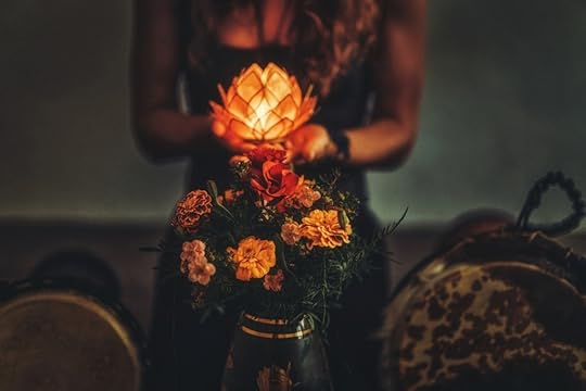 featured photo of woman holding a lit lotus behind a vase of flowers by Jozef Klopacka / my morning shots (orange blossoms and fiery sky)