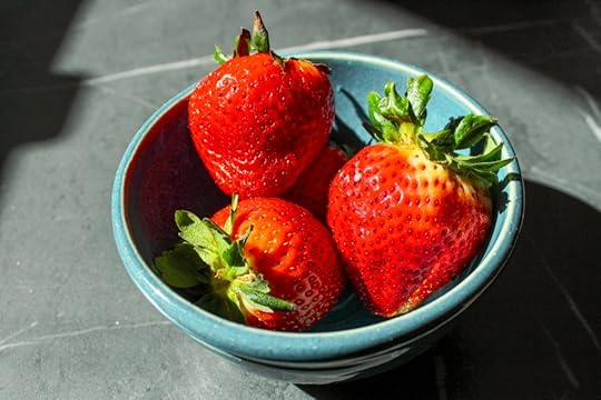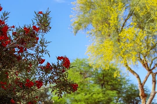 my photos of strawberries, Campsis Radicans ‘Flamenco’ bush & Palo Verde tree, and my next poetry read: All the Words I Kept Inside by P.J. Gudka & fake flowers in vase I painted years ago (my daughter is the artist