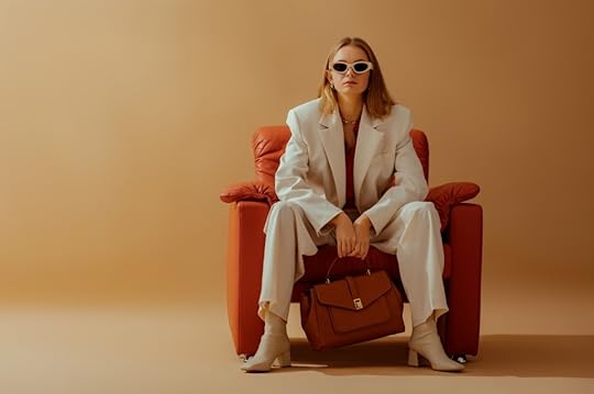 featured photo of a woman in business suit and boots, holding a satchel, sitting on a chair taken by Victoria Fox / my outdoor selfie, wearing gifted Native American earrings and my reading glasses, taken at the start of letting my hair grow out [image error]
