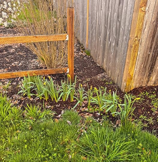 Tulip bulbs delivered from Holland last autumn, planted while visiting, are now growing in rich Oregon soil!
