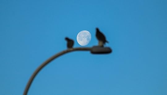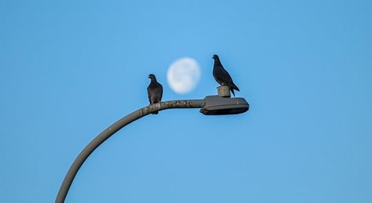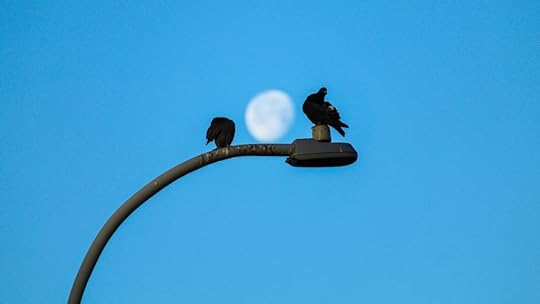 my photos of morning moon shining through two birds pruning and preening on a lamppost covered in poo