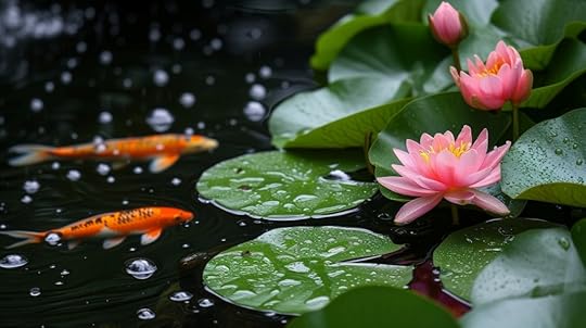 photo of woman doing the Camatkarasana pose by fizkes / pink lotus flowers and two orange koi fish by MarcGugDesigns
