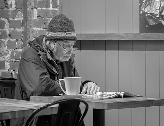 While looking over the menu, she noticed a man sitting alone. He was staring out the window while twirling a spoon in his coffee, round and round and round.