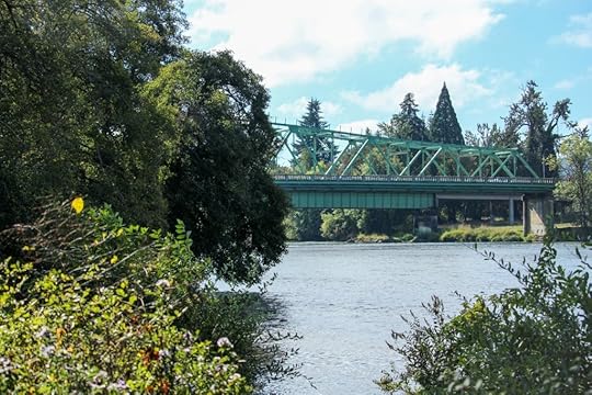 my photos taken today in Oregon (sunflowers, roses, trees, river, bridge, park, mailbox, sunset thru the trees, & Caly the cat)