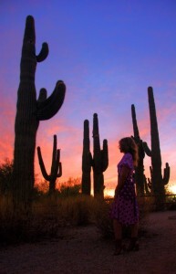 my photos, last night’s sunset (5/25) and a saguaro sheltering birds and blossoms earlier the same day