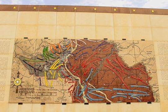 my photos, Luxembourg American Cemetery (photo 1: final resting place for 5,076 American Soldiers, incl. General George S. Patton, 118 of Jewish faith represented by the Star of David headstones photo 2: gate sculpture at main entrance/exit photo 3: map of battle operations in northwestern Europe photo 4: interior of the memorial chapel photo 5: wider view of cemetery photo 6: forest near entrance/exit photo 7: memorial pillar with dedication)