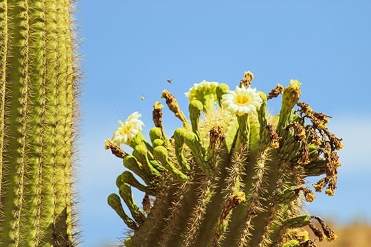 At dusk last night I ventured out in search of blooming Saguaro. Now is the time for the seasonal appearance of the gorgeous flowers adorning their thorny hosts that attract birds, bees, insects, and nature enthusiasts who appreciate their sweet nectar and fleeting beauty.
