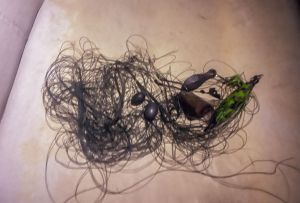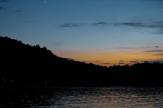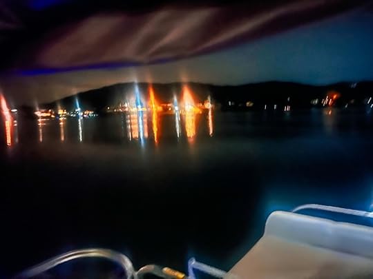 Thank you for watching the video (if you had a chance). More to come from this beautiful and liberating weekend that included cool swimming and double rainbows on Saturday. About the “long story” mentioned in the video… on our way back to shore, we crossed paths with two young men fishing from the shore. One was waving wildly at us. Becky slowed. We learned, through some exchanged words, that they had six lines cast in the lake. Becky turned the engine off. From the boat ladder I shined my phone light on the situation while Becky climbed onto the barrel. She proceeded to pull line after line (that had become tangled)—cutting each one with the knife Tracy handed her. Teamwork! The photo is part of the mess. Becky tossed the lure back to them and also told them to make sure they have lights out next time.