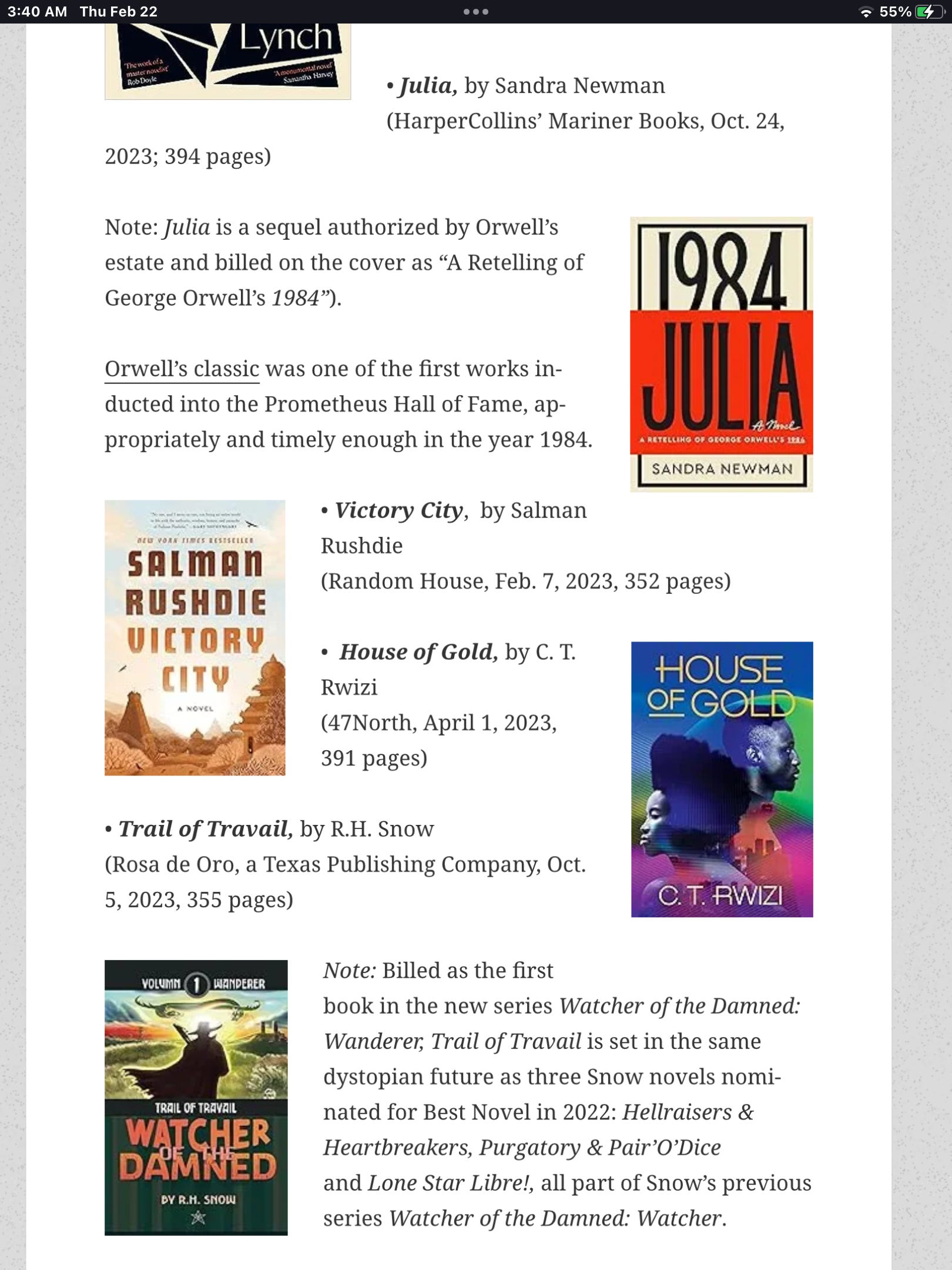 Congratulations to all the rightly deserving Prometheus Best Novel of the Year Nominated Authors, including the illustrious @WoodFenton @Devon_Eriksen_ @itsDanielSuarez @KarlKGallagher (also found here as on substack!) @SteveWire5, Salman Rushdie, Paul Lynch, Naomi Krizter, Howard Andrew Jones, C. T. Rwizi, Sandra Newman, Gordon Hanka, Mackey Chandler, C J Carey, Alan Zimm, Stephen Albercht -