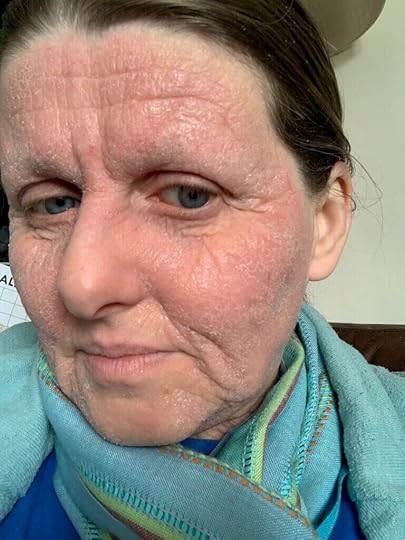 Inflammation on my face, called red face syndromeFacial swelling that cycles into crusting and flaking on my faceLoss of all my eyebrows again for the fourth time. I don’t like how I look without eye brows.Collagen stripping and deep crevices, like wrinkles but not the same as they itch deep insideI don’t like how i look in the mirror. I look ill, old, red, puffy and it makes me so sad.Red sleeves, typical of TSW. These I can handle, wrap, bandage and treat until the cycle passes.Open oozing wound on chest (this has just closed up and stopped oozing as of today so let’s celebrate the small wins!) When you’re just pleased your boobs have stopped oozing that says a lot about the general effort of every day life with TSW.I can handle the rest of my body because I can cover, bandage and hide it much more easily.