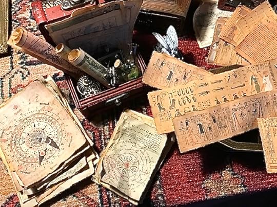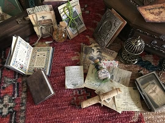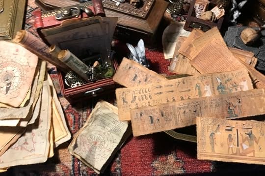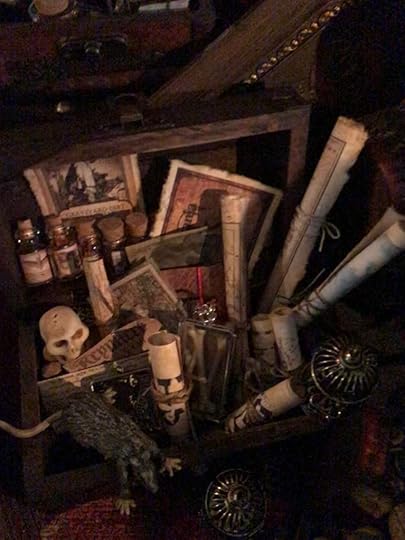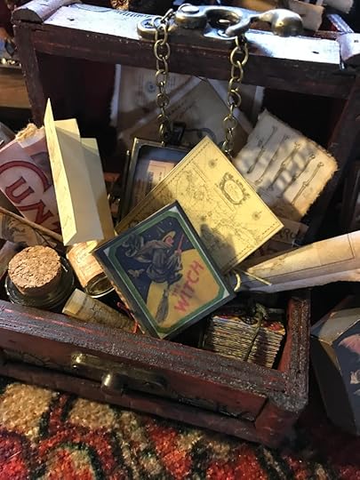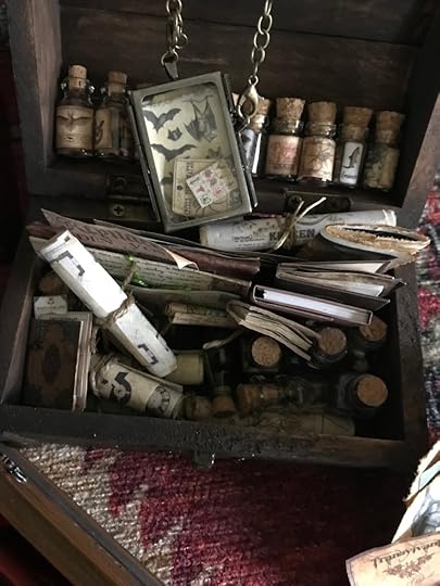 There are dozens of chests and trunks stuffed with miniature books, scrolls, rolled maps, brass items, miniature glass bottles, rats, bones, etc.
