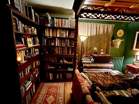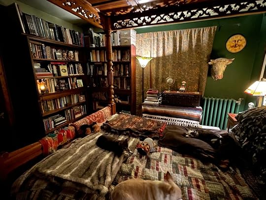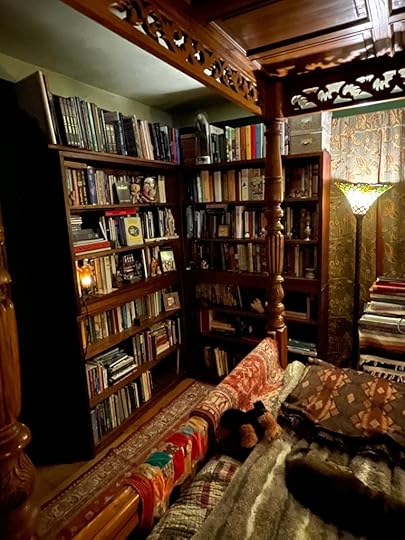 We moved the second mahogany bookcase into our bedroom while John scrapes and preps the Iceland Room for painting. I decided to see how it would look if we kept both bookcases in the bedroom. And I am thrilled with the result. Now I have all my most favorite books and the books that I use most for research (archaeology, prehistory, folklore, vampyres, Cape Cod, Mayflower, etc.) close at hand.