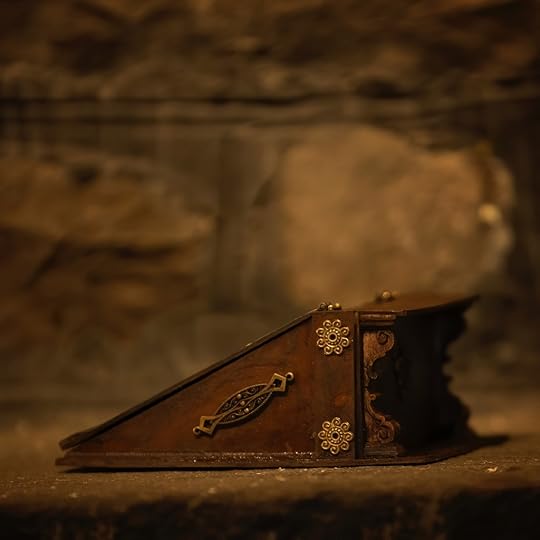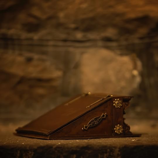 I found a fantastic leather smith down in NYC that makes these rugged distressed leather journals. She is making one for me without the regular journal pages and I will insert the replica 17th century diary pages that Phin discovers in the secret library.